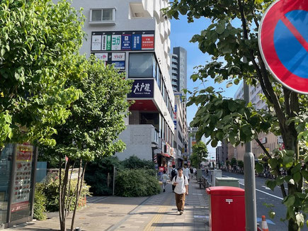 その隣の大戸屋などの看板があるのが当事務所のビルです。1階にKFC(ケンタッキーフライドチキン)と松のやが入っています。ビルに入ってエレベーターに乗り3階に降りると、エレベータの前が事務所入口になります。